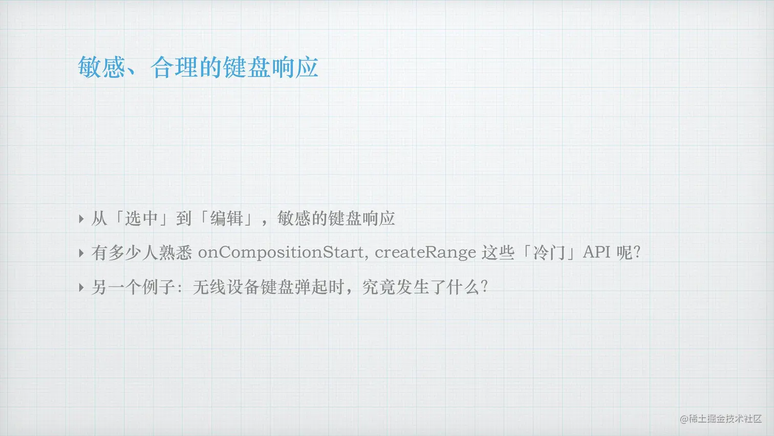 说了这么多,是什么意思呢?我想说的是,在研发文档级应用时,我们几乎要重新认识浏览器,那些冷门的知识,在 MDN 上几乎没有任何解释的 API,有可能会突然成了救命稻草。为什么呢,因为这些 API 很可能来源于操作系统本身的一些概念,比如 onCompositionStart,当我真正了解到它的含义时,我很确定操作系统的输入法接口中,肯定有对应的概念存在。
