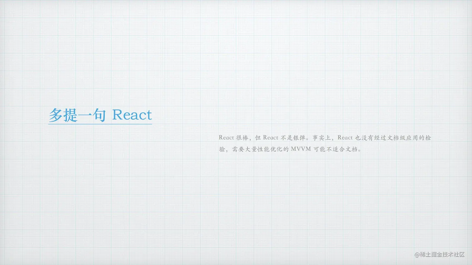 这里我想多说一句 React。React 现在是最热门的前端开发框架了。但是,React 不是银弹。其实 React 并没有经过文档级复杂度前端应用的考验。在文档这种复杂前端应用中,大量存在各种各样的优化,而这种声明式的编程方式,优化起来要比命令式的 DOM 操作难很多。举个例子,同构表目前还不是受控组件。我们知道 React 中有受控组件和非受控组件的区别,比如一个 input 组件,你传 defaultValue,那就是非受控,你不需要关心组件内部的行为,你只需要在合适的时候去从 ref 上取 value 就行了;如果你传的不是 defaultValue 而是 value,那么就是受控模式,你需要自己在 input 外面去管理 value。