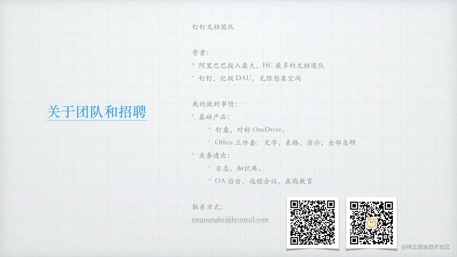 简单介绍下我们团队:我们是钉钉文档团队,愿景什么的就不多说了。说点实际的,它是阿里巴巴目前投入最大,HC 最多的文档团队,想象空间非常大。钉钉有着亿级的 DAU,团队组建了一年多两年不到的时间,正在快速的增长当中。