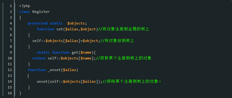 注册模式,解决全局共享和交换对象。已经创建好的对象,挂在到某个全局可以使用的数组上,在需要使用的时候,直接从该数组上获取即可。将对象注册到全局的树上。任何地方直接去访问。