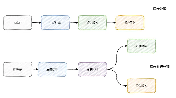调用链路长、响应就慢了,并且相对于扣库存和下单,积分和短信没必要这么的 "及时"。因此只需要在下单结束那个流程,扔个消息到消息队列中就可以直接返回响应了。而且积分服务和短信服务可以并行的消费这条消息。