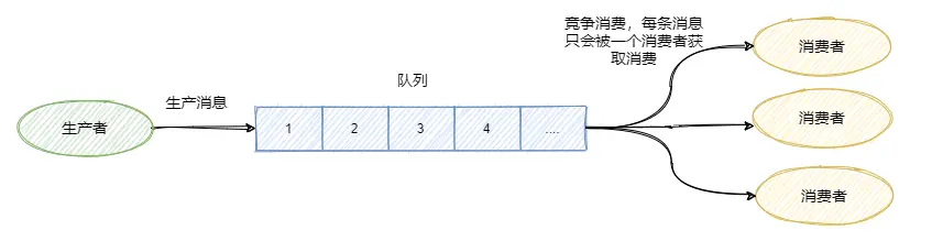 生产者往某个队列里面发送消息,一个队列可以存储多个生产者的消息,一个队列也可以有多个消费者, 但是消费者之间是竞争关系,即每条消息只能被一个消费者消费。