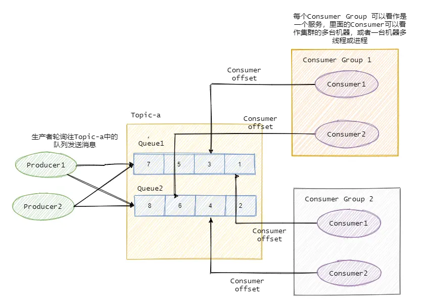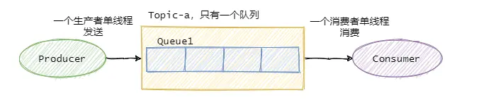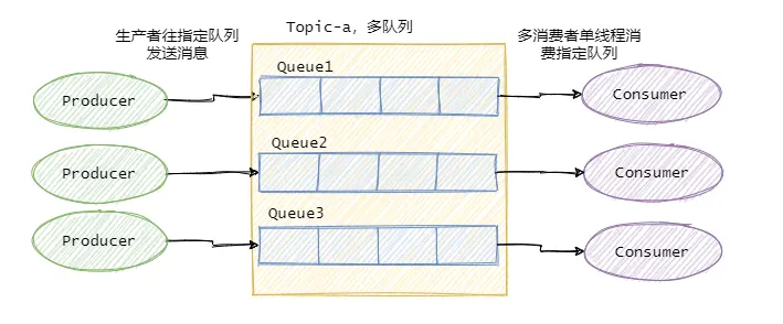 图中我画了多个生产者,一个生产者也可以,只要同类消息发往指定的队列即可。