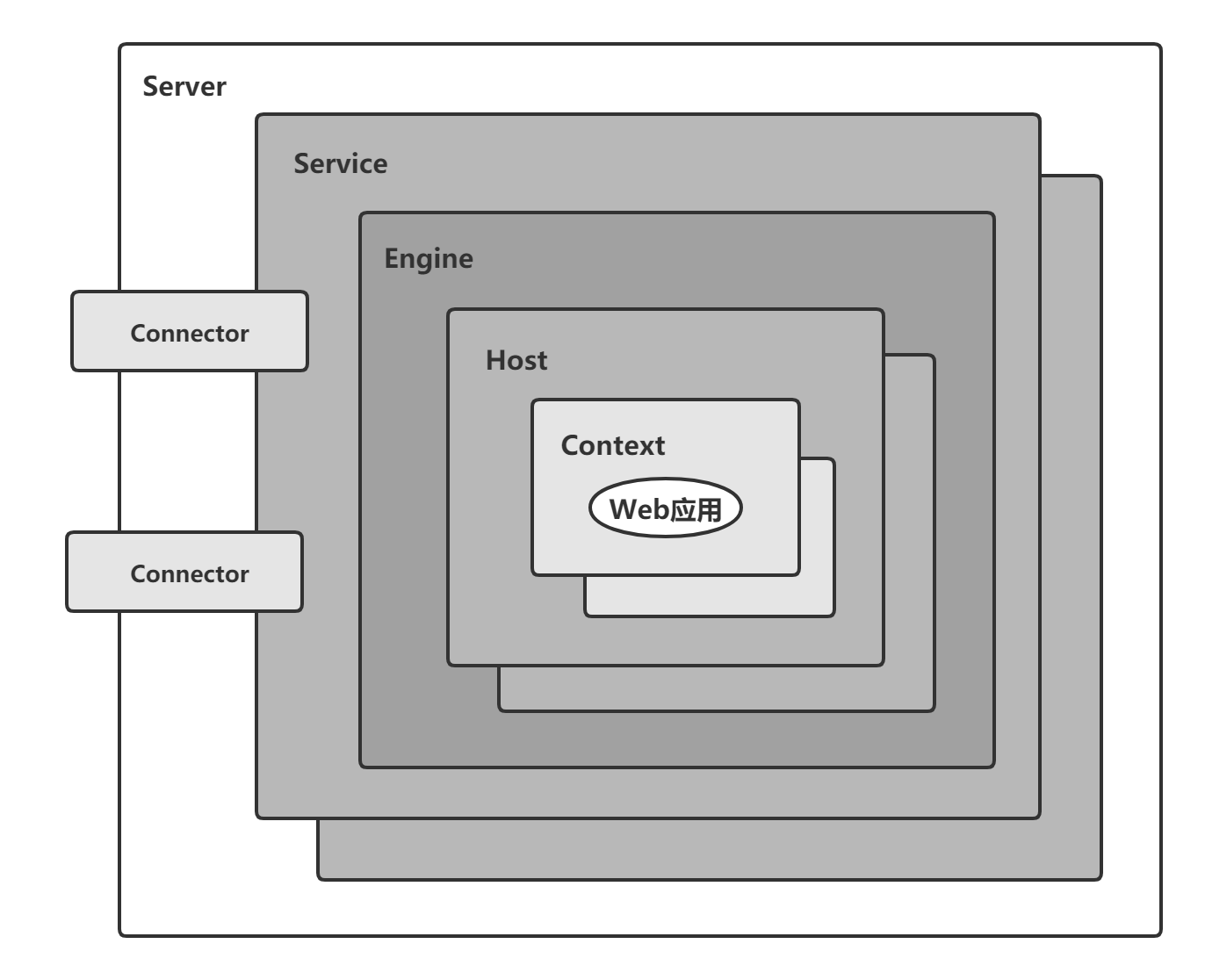 - Service 从这一层往下,我们一般称为容器(Container),Catalina是它的具体实现,这也就说明了为什么前面配置环境变量,用的就是Catalina的这个名字。下属多个Connector,下属一个Engine。