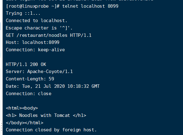 现在我们来试着访问一下静态资源,在这里就是豆浆的页面,在浏览器上输入网址:http://192.168.142.10:8099/restaurant/SoybeanMilk.html , 出现Soybean Milk的字样,说明成功访问到了。 接着我们来尝试访问动态资源,对应这里就是访问面条的页面。在浏览器上输入网址:http://192.168.142.10:8099/restaurant/noodles ,这里的面条没有添加任何配料,配料返回的是默认的Tomcat。