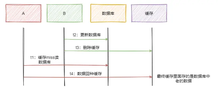 “不对不对,先更新数据库,再删除缓存。假如有个A先读缓存,但是此时缓存是没数据,于是去数据库读数据,读到了数据,然后此时有B来更新数据库,然后删除了缓存。此时A再把缓存写回,这不就出问题了吗?表哥,你行不行啊?奶茶退我!” 表弟不乐意了。