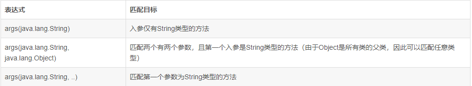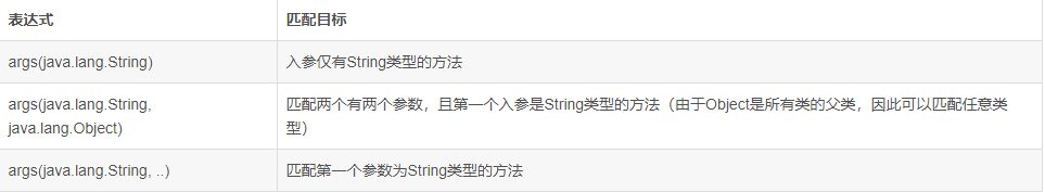 注意,由于args匹配是动态切入点,开销比较大,非必要的情况下建议尽量少用(待确认)
