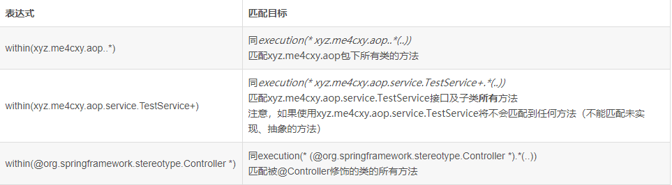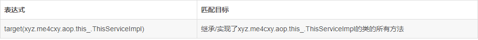 匹配当前AOP代理对象类型的执行方法,说白了就是匹配类型中重写/实现的方法,父类中未重写或实现的方法则不会被匹配(可以称为作用域为当前对象,非super的方法)。其中表达式规则如下