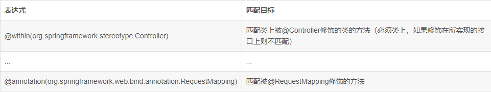 @within、@target、@args同within、target、args中匹配注解的简略写法,但该种只能匹配基于注解,无法匹配类型