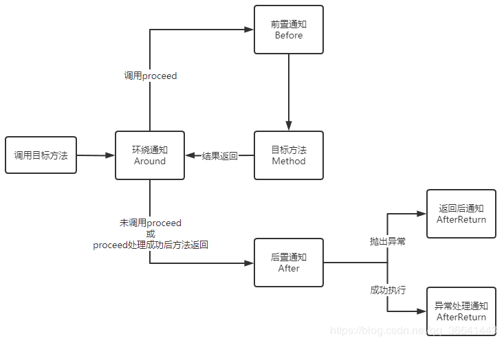 Before 前置通知,于目标方法执行前执行 After 后置通知,在目标方法执行后执行,但在@AfterReturn、@AfterThrowing之前执行 AfterReturn 返回后通知,在方法成功执行并返回结果时执行 AfterThrowing 异常处理通知,在方法执行过程中抛出异常时执行 Around 环绕通知,最特殊的通知方式,可以实现上面几种通知相同的功能,但该通知不同于@Before,需要自己手动通过ProceedingJoinPoint.proceed进行调用切入方法 执行顺序如图