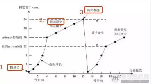 一开始使用慢启动,即拥塞窗口设为1,然后拥塞窗口指数增长到慢开始的门限值(ssthresh=16),则切换为拥塞避免,即加法增长,这样增长到一定程度,导致网络拥塞,则此时会把拥塞窗口重新降为1,即重新慢开始,同时调整新的慢开始门限值为12,之后以此类推。