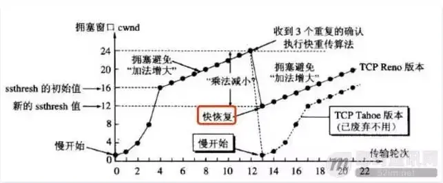 快恢复:上面的拥塞控制会在网络拥塞时将拥塞窗口降为1,重新慢开始,这样存在的一个问题就是网络无法很快恢复到正常状态。快恢复就是来优化这个问题的,使用快恢复,则出现拥塞时,拥塞窗口只会降低到新的慢开始门阀值(即12),而不会降为1,然后直接开始进入拥塞避免加法增长,如下图所示: