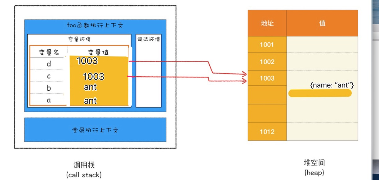 在 JavaScript 中,赋值操作和其他语言有很大的不同,原始类型的赋值会完整复制变量值,而引用类型的赋值是复制引用地址。 原始类型的数据是存放在栈中,引用类型的数据是存放在堆中的。堆中的数据是通过引用和变量关联起来的。