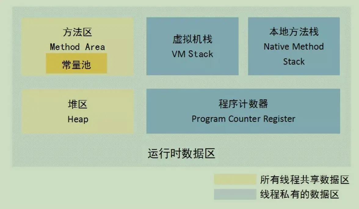 - 方法区:被jvm加载的类的信息,常量,静态变量,即时编译后的代码等数据