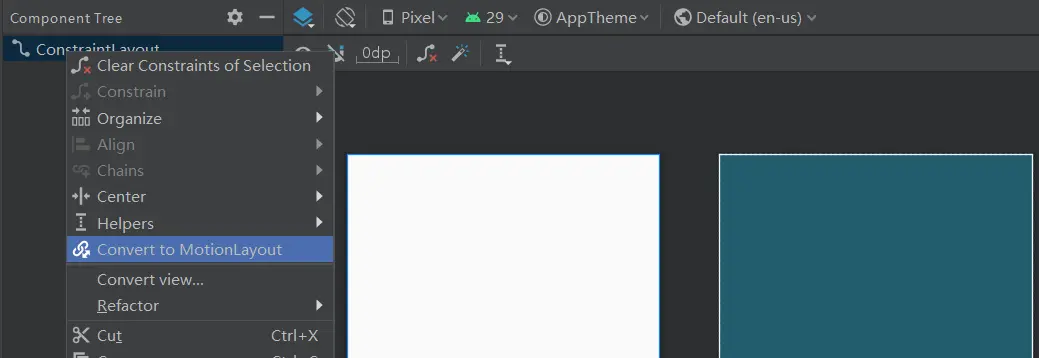 新建一个Activity,名为MotionLayoutActivity,这个时候系统已经为我们创建好了一个默认的布局文件,根布局为ConstraintLayout, AndoridStudio中可以快速创建res/xml文件夹下面的文件,如下图,布局文件切换到全预览界面,找到ConstraintLayout ,右击选择convert to MotionLayout,就会看到res目录下面已经创建了一个xml目录和一个跟我们当前布局对应的场景动画xml文件。