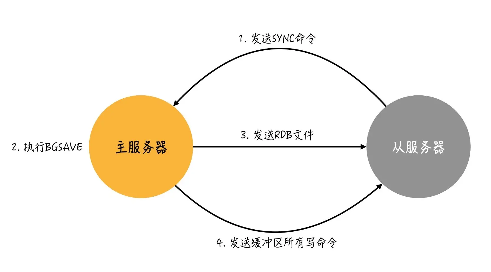 BGSAVE之后,主服务器会将RDB文件发送给从服务器,从服务器接收并载入这个RDB文件 - 主服务器将记录在缓冲区的所有写命令发送给从服务器,从服务器执行这些写命令
