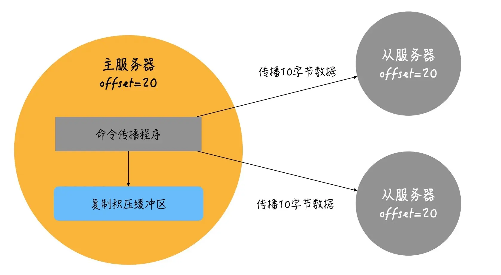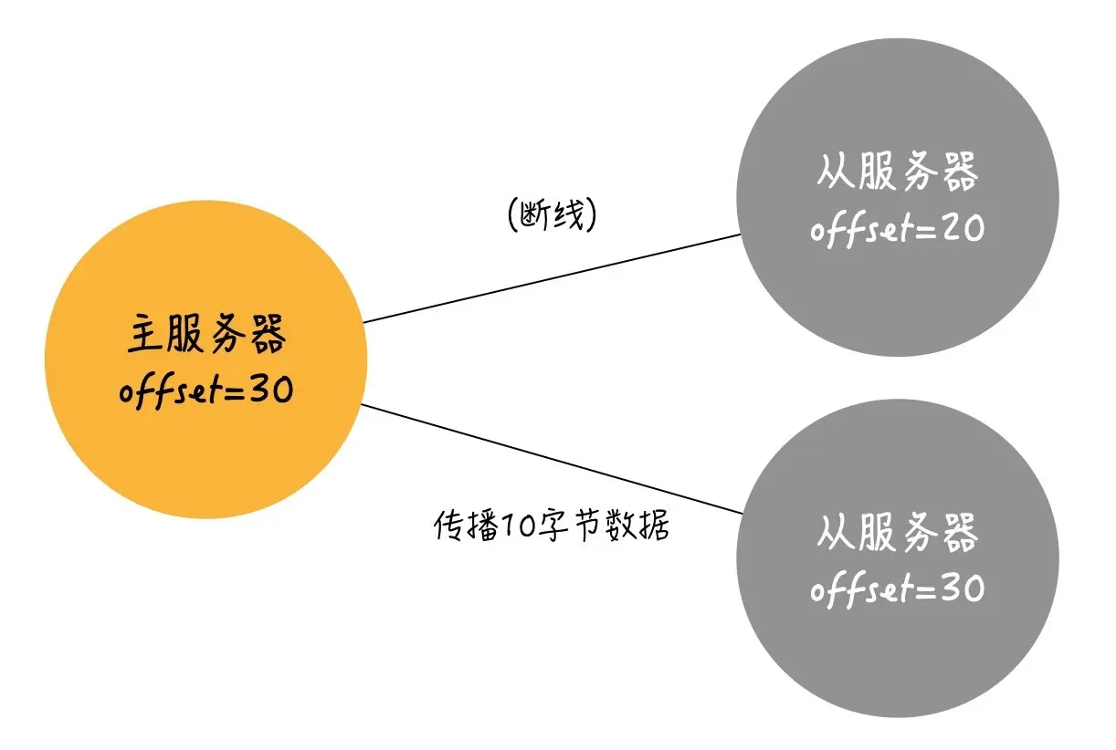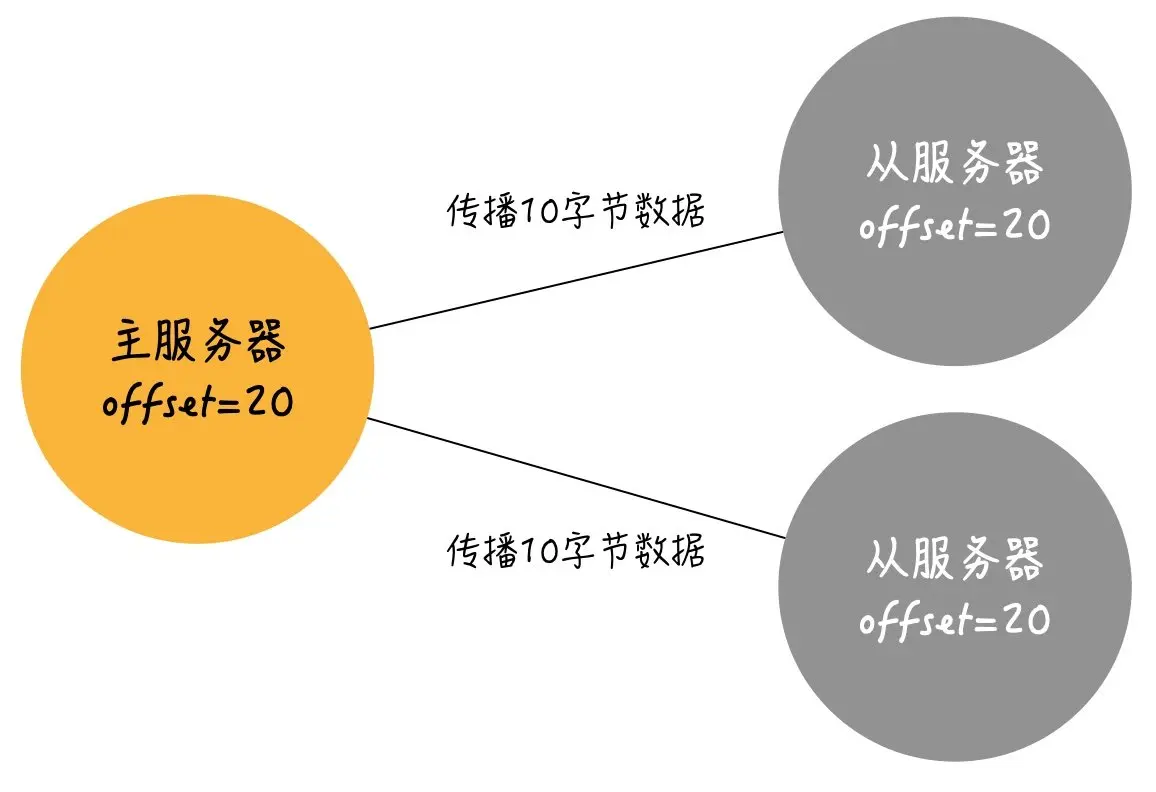 - 主服务每次向从服务器传播N个字节的数据(写命令)时,就将自己的复制偏移量加N