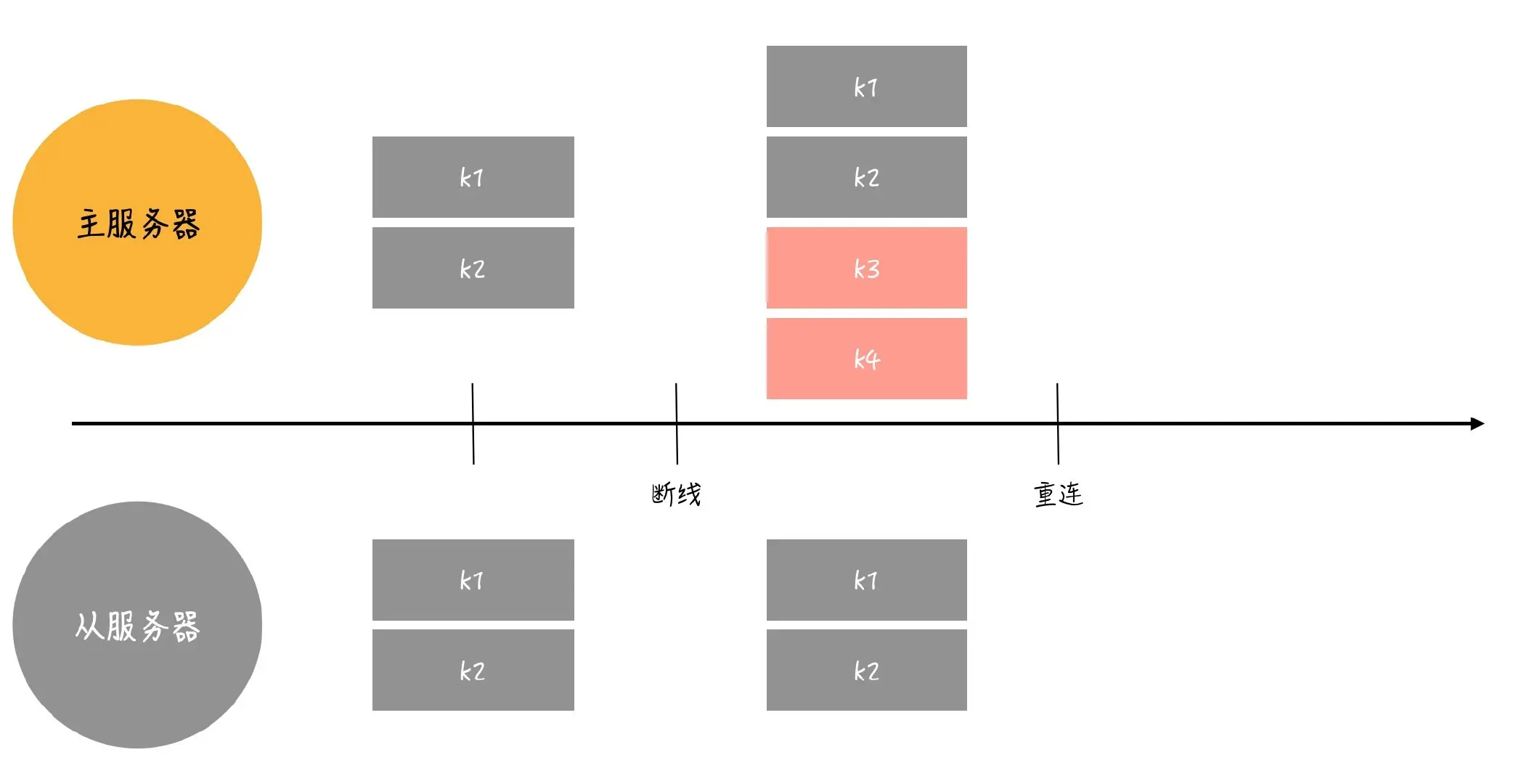 如上图的情况,从服务器在某一刻断线,再此期间主服务器增加了k3,k4两个键,按目前的实现逻辑,从服务器在之后重连后,依旧是再次发送SYNC命令进行同步(主服务器生成和发送RDB文件给从服务器载入)