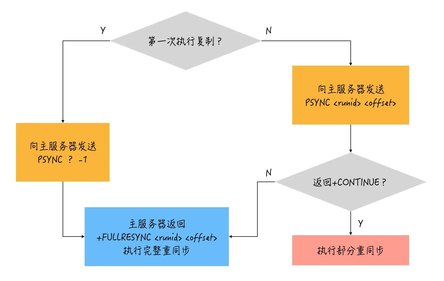相同,则说明断线前复制的就是当前连接的主服务器,主服务器可以根据条件尝试进行部分重同步 - 如果与主服务器的运行ID