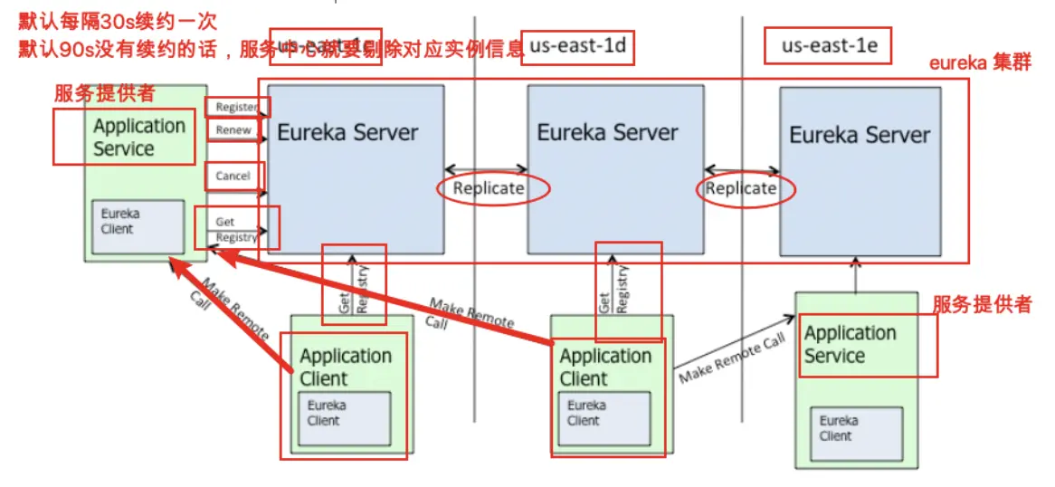 - Eureka Server会定时(间隔值是eureka.server.eviction-interval-timer-in-ms,默认60s)进⾏检查, 如果发现实例在在⼀定时间(此值由客户端设置的eureka.instance.lease-expiration-duration-inseconds 定义,默认值为90s)内没有收到⼼跳,则会注销此实例。