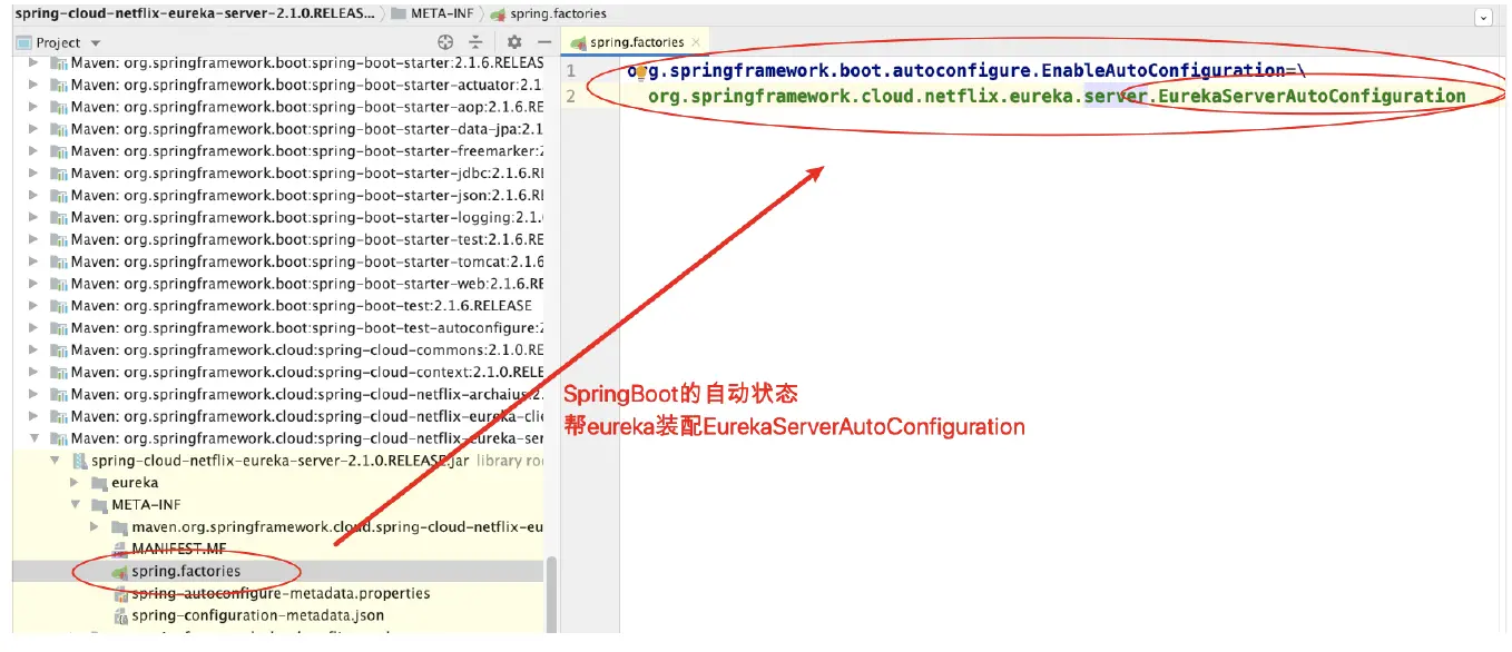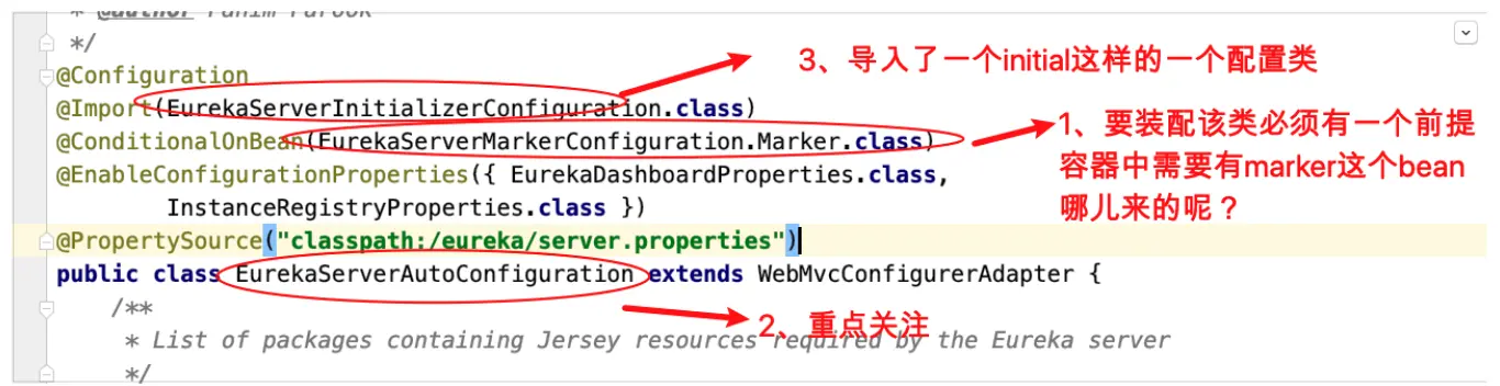 - 用SPI机制自动启动时装载了EurekaServerAutoConfiguration⾃动配置类,标记,标记@EnableEurekaServer,可进行自动配置。