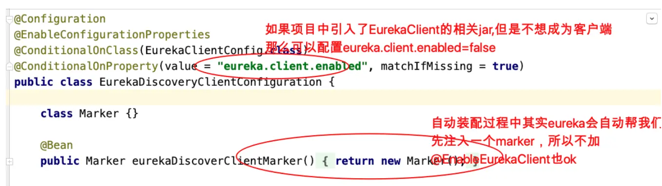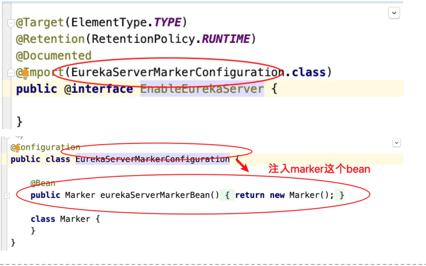- EurekaServerAutoConfiguration类 需要有⼀个marker bean,才能装配Eureka Server,那么这个marker其实是由@EnableEurekaServer注解决定 的,如下: