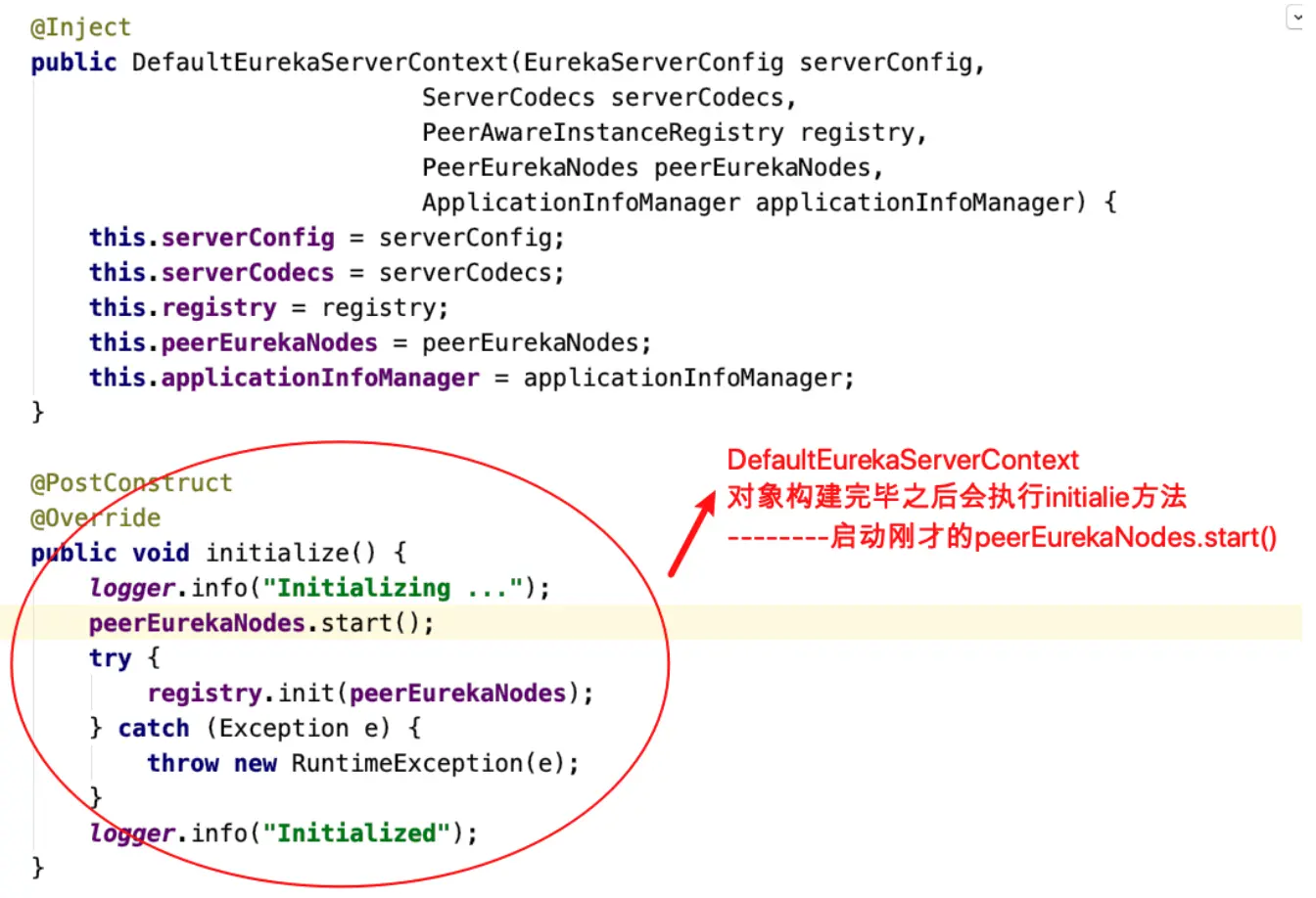 - 进入到 eurekaServerContext 中,可以看到init方法,会启动上面更新对等节点的线程池start()方法。