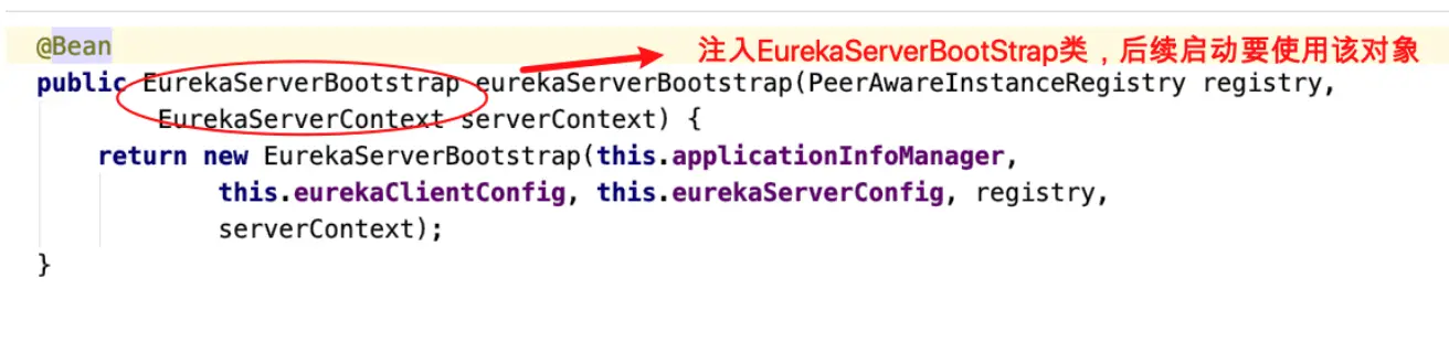 - 回到主配置类中,看到 eurekaServerBootstrap 也注册成@Bean组件,如下: