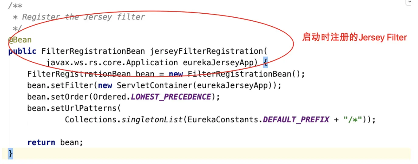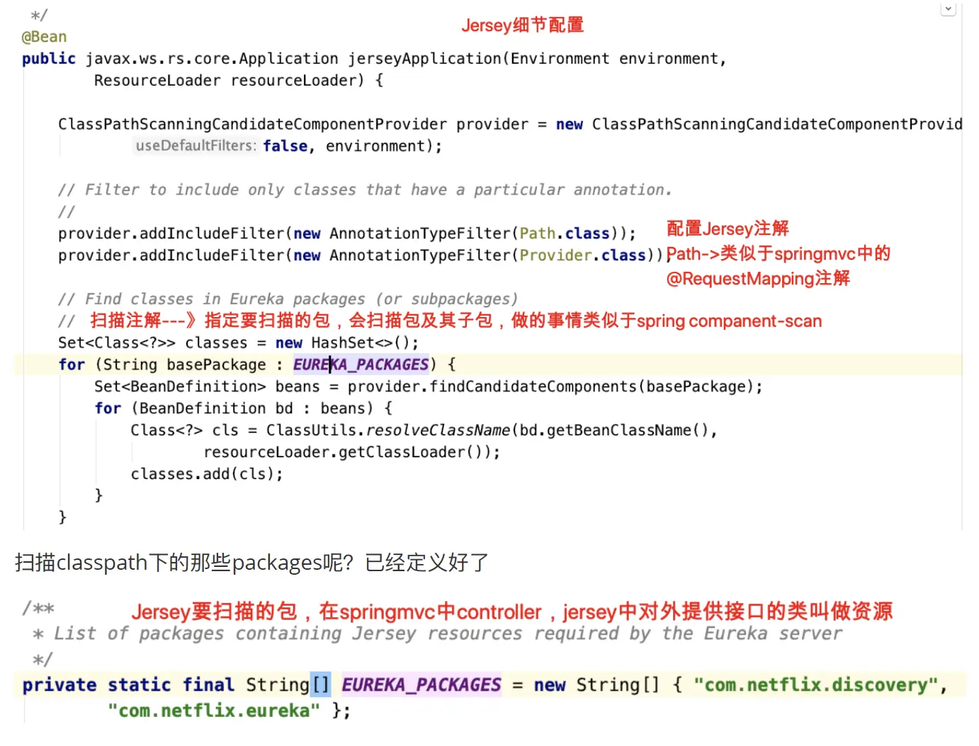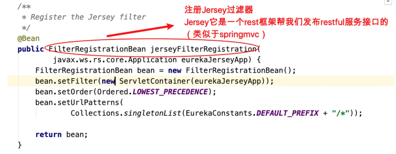 - 在Eureka Server启动过程中主配置类注册了Jersey框架(是⼀个发布restful⻛格接⼝的框架,类似于我 们的springmvc)
