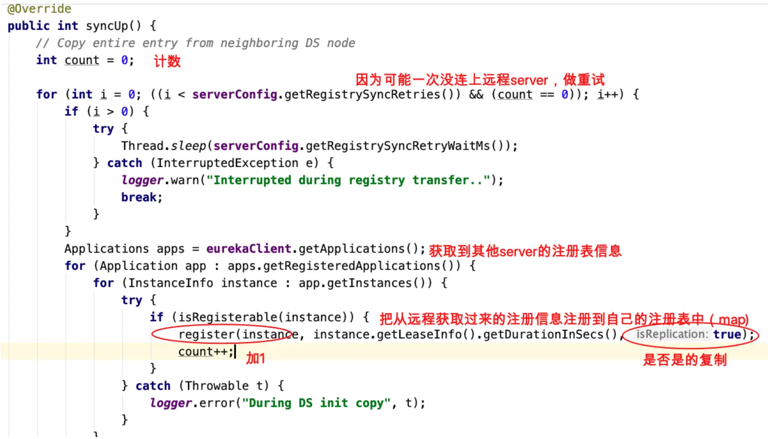 - 研究⼀下上图中的syncUp⽅法 继续研究com.netflix.eureka.registry.AbstractInstanceRegistry#register(提供实例注册功能)