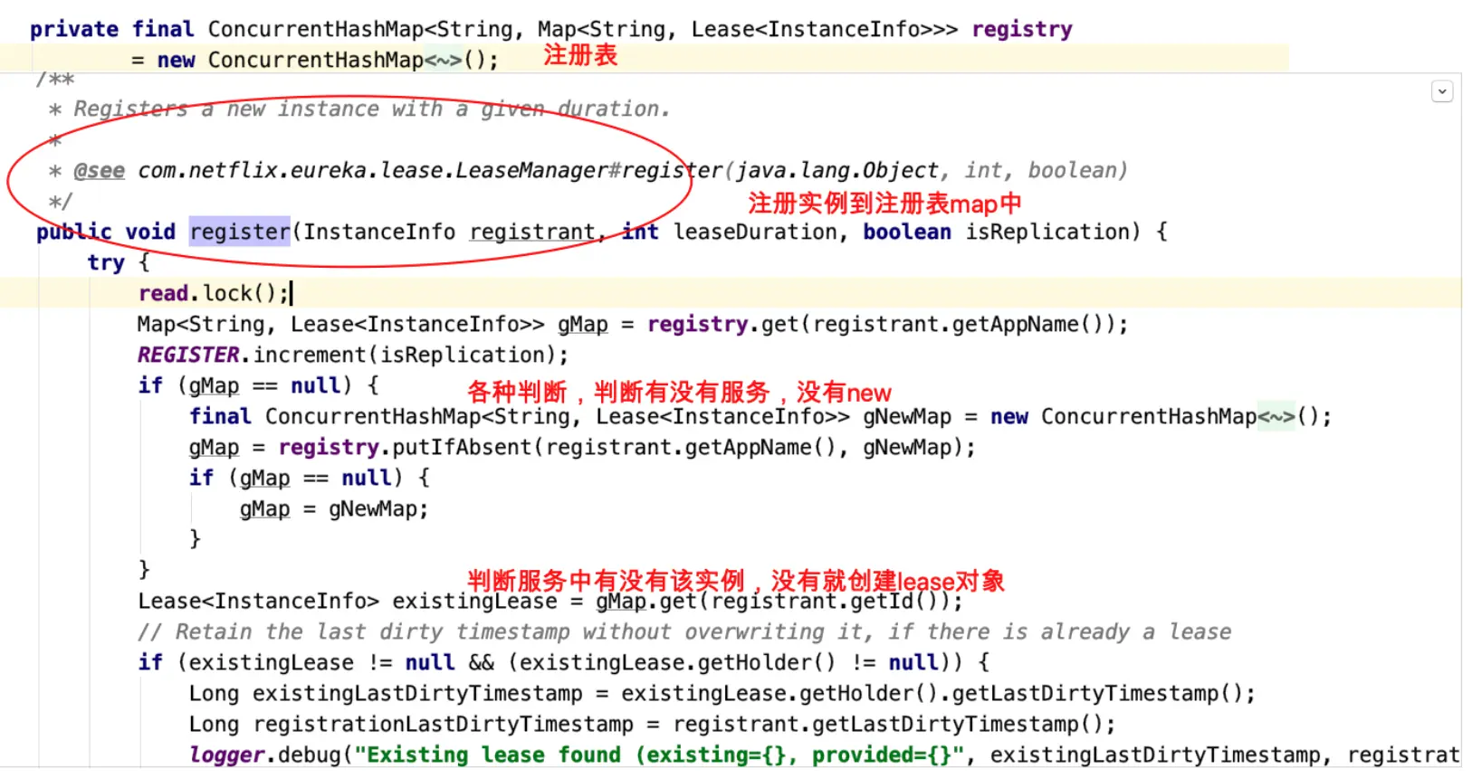 - 点击super.register 来到 com.netflix.eureka.registry.AbstractInstanceRegistry#register,注册,实例信息存储到注册表是⼀个ConcurrentHashMap