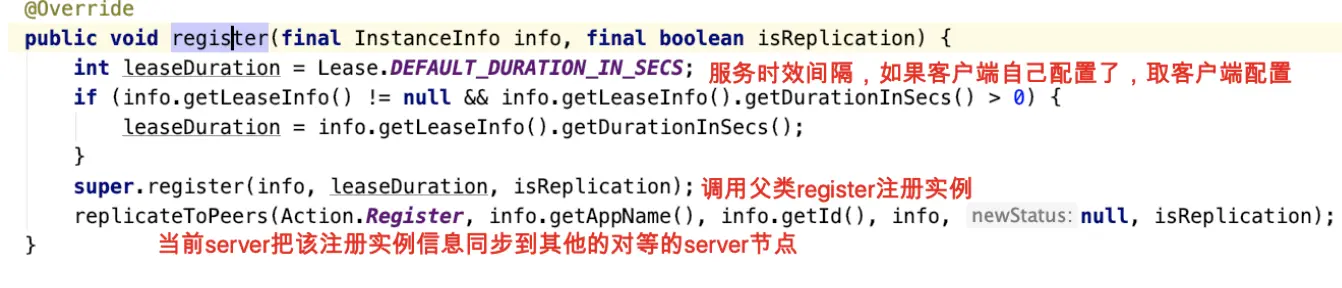 - 点进register 找到实现类 com.netflix.eureka.registry.PeerAwareInstanceRegistryImpl#register 注册服务信息并同步到其它Eureka节点
