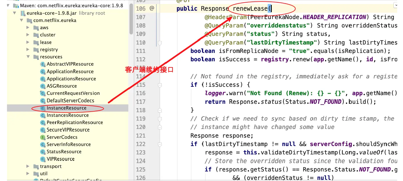 - com.netflix.eureka.resources.InstanceResource#renewLease⽅法中完成客户端的⼼跳(续约)处理,关键代码: registry.renew(app.getName(), id, isFromReplicaNode);