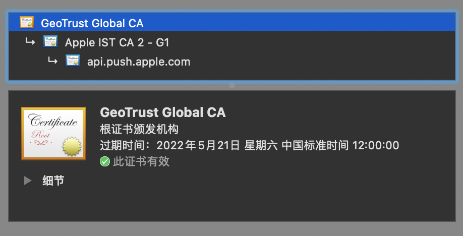 然后用chrome打开苹果推送域名api.push.apple.com,发现证书是正常的,至少谷歌认为是正常的.想想也是苹果这么大公司,不至于证书都有问题