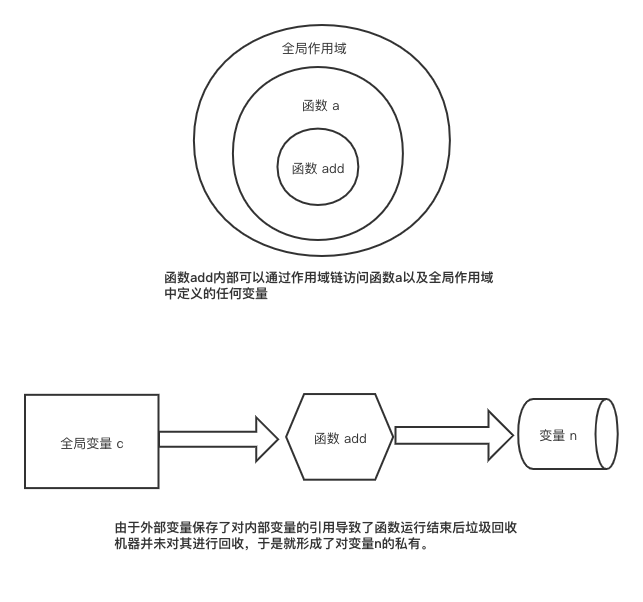 变量c引用了add函数而add函数引用了变量n,那么变量c间接地通过了add函数完成了对变量n引用。所以就导致了js引擎一直没有对变量n进行内存回收,因此我们每次运行c()都会基与内存中变量n的值,故而产生了闭包这种现象,看到这里是不是有种恍然大悟的感觉。