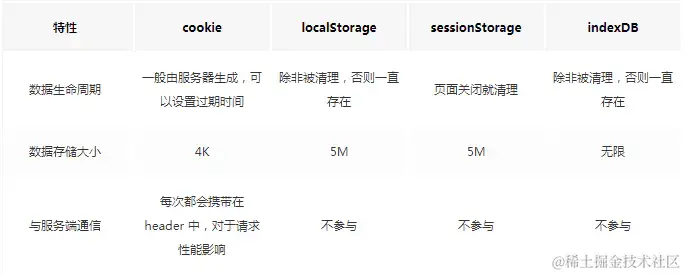 - sessionStorage:sessionStorage更适合用来存储生命周期和它同步的会话级别的信息。这些信息只适用于当前会话,比如可以用来做表单数据的持久化,防止刷新后表单数据丢失。比如微博的 sessionStorage就主要是存储你本次会话的浏览足迹