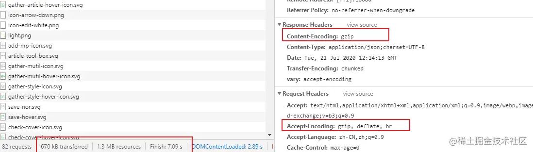 压缩 与 不压缩的区别在于 ,响应的速度会有很大的差距,携带传输文本的体积也不一样;开启压缩技术能够减少带宽,建议大家开启gzip压缩,加快请求和响应速度;