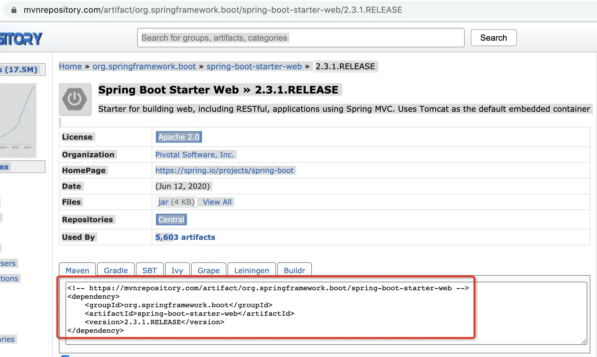 进入后,在搜索框输入构件名称,可以进行模糊查询,点击某一版本的构件后,可以提供maven构件依赖的引入内容,直接复制到代码里面黏贴即可,注意在启用了spring-boot-starter-parent版本号管理后去掉具体具体每一个构件的版本号。