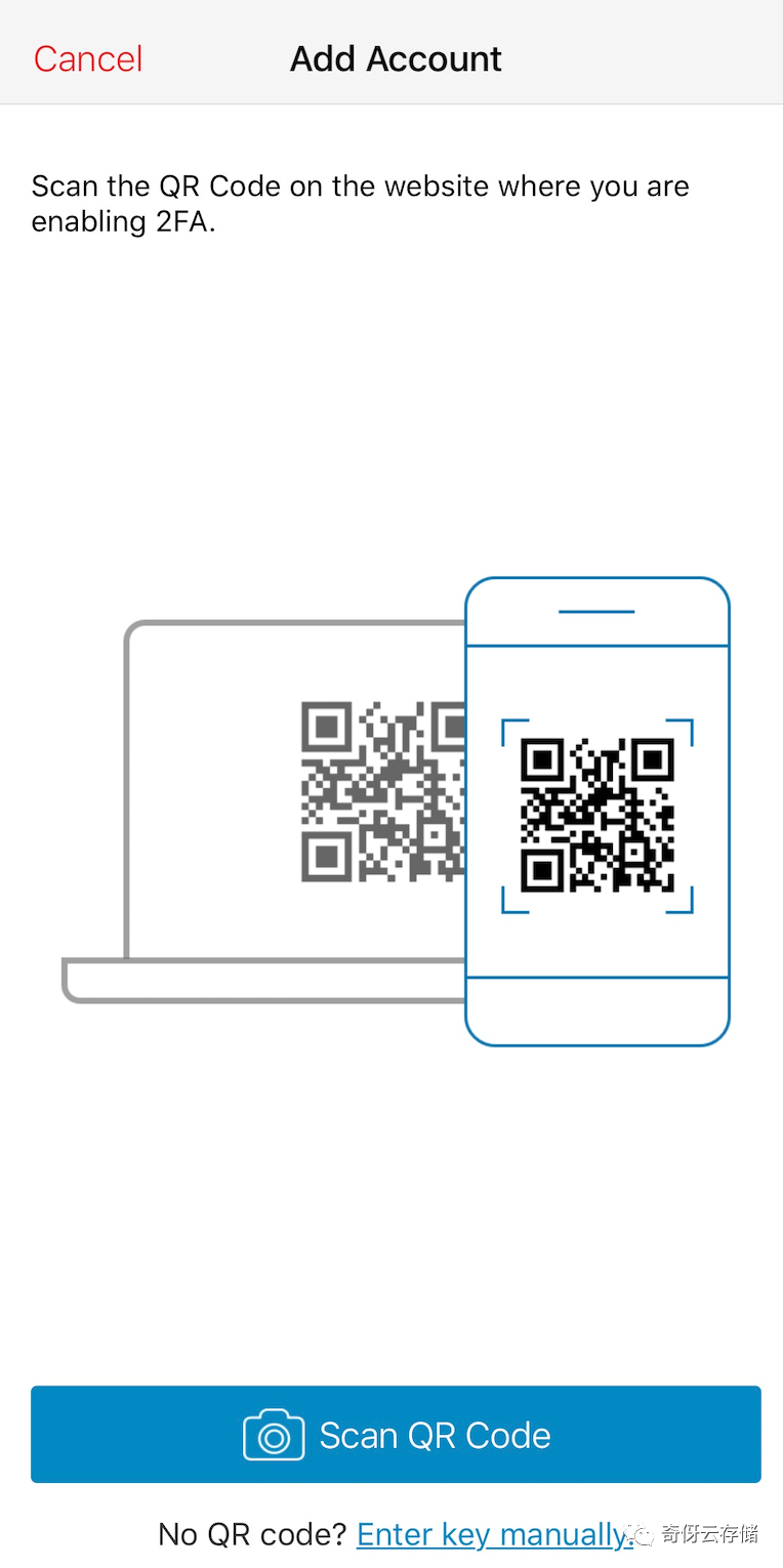 点击 “+” Add Account,添加账户,会弹出一个叫你扫描 QR Code 的界面:
