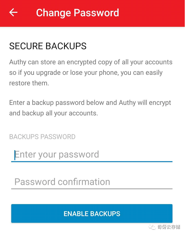 功能上,上面已经都完成了。最后一步是可选的,但是个人觉得也是必须的。因为 Authy 把数据可以选择开启云端备份,那么这个也必须考虑安全性问题,所以 Authy 的策略是加密备份,让你设置主密码。