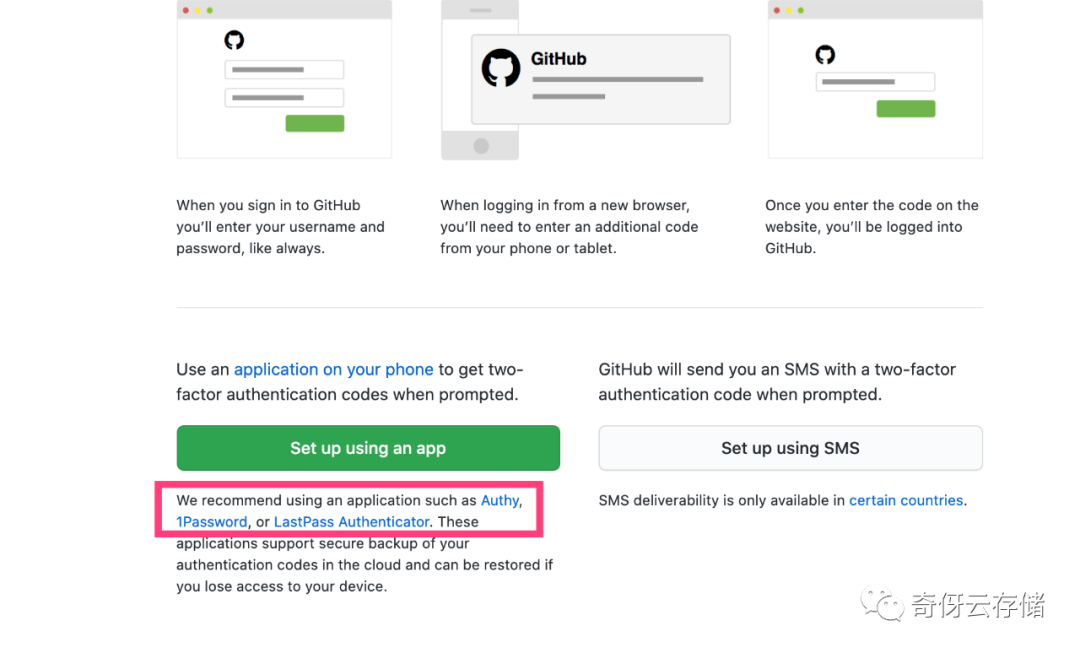 其实,Github 官方也是首选推荐 Authy,1Password 等工具来做 2FA 工具的,如图:
