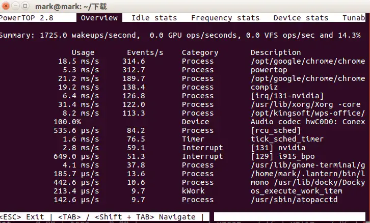 运行方法:sudo powertop