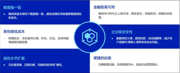 高可用性是另一关键特性。数据库拥有灵活的全球部署架构,轻松支持异地多活,合适的切换专家库切换原则从“不可用就切”,优化为“如果切过去会更好,才会切”,有效避免无效切换。任何一个数据中心发生故障,都可以无缝地、自动化地切换到另外一个数据中心继续服务。