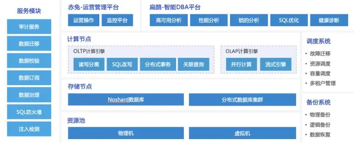 TDSQL产品架构不仅仅包括数据库部分,还包括周边完善的配套机制和产品服务生态,总体包含资源池、存储节点、计算节点、自动化运营管理平台“赤兔”、智能DBA平台“扁鹊”、服务模块、调度系统、备份系统等,以及异构数据库多源迁移同步方案等。
