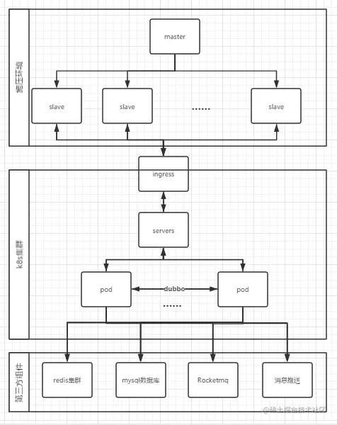压测端使用jmeter分布式压测,被测端使用k8s集群容器化部署,业务上述的链路如下图,实际中间件和第三方服务不止列举的这些,压测环境下,第三方厂商和直连平台接口使用mock(固定响应实际50ms)接口代替。