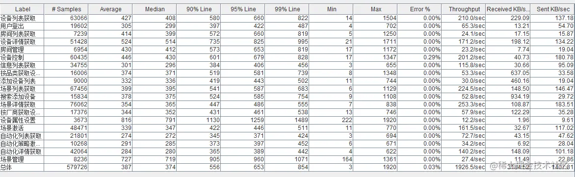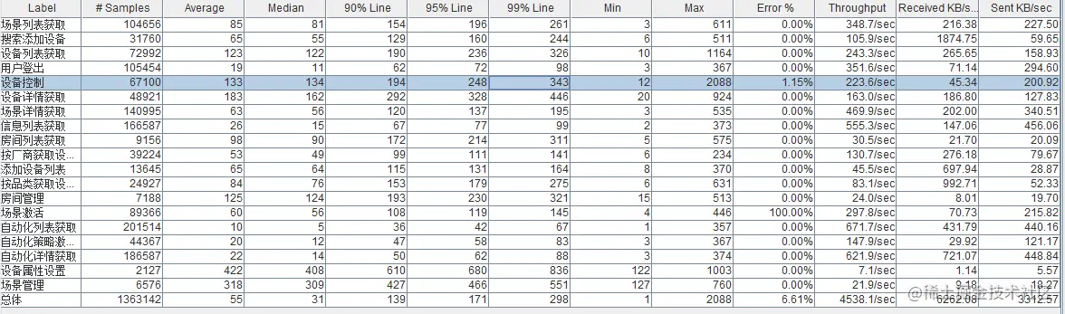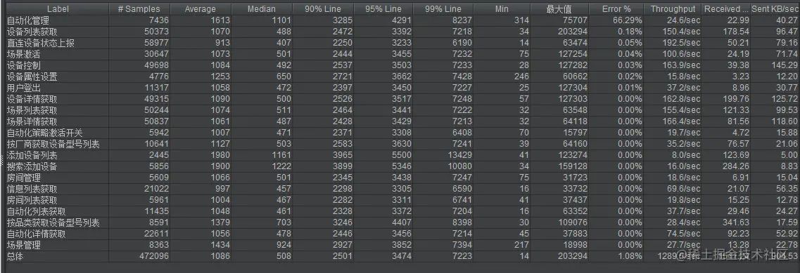 调优后,重新进行压测IOT平台,效果如下,基本所有接口均满足500W用户性能要求的一半,故现网部署两倍的最小集群即可。