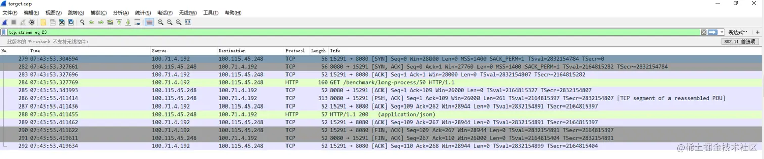 压测过程使用脚本判断TCP建立连接时间,业务耗时时间,结束时间(使用shell脚本,for循环模拟单线程一直执行curl命令即可),发现响应时间和jmeter一致,且TCP建立时间短。说明压测端没有问题。
