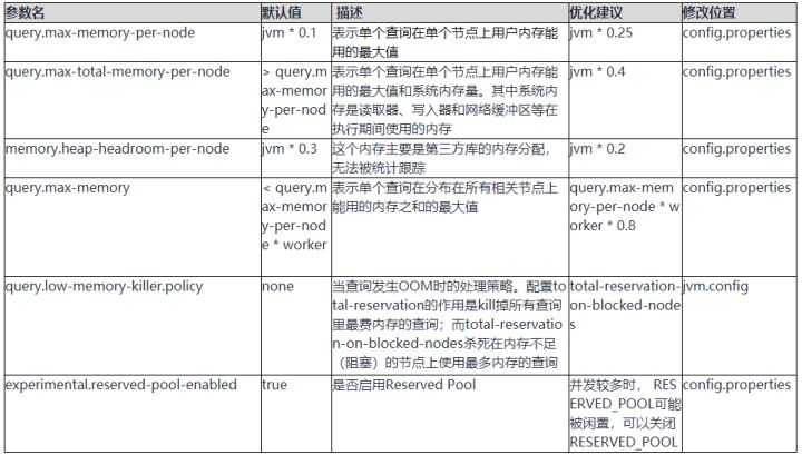 • query.max-total-memory-per-node:表示单个查询在单个节点上用户内存能用的最大值和系统内存量。其中系统内存是读取器、写入器和网络缓冲区等在执行期间使用的内存。