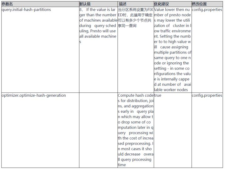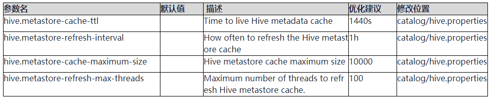 Presto支持Hive connector,元数据存储在Hive metastore中,调整元数据缓存的相关参数可以提高访问元数据的效率。