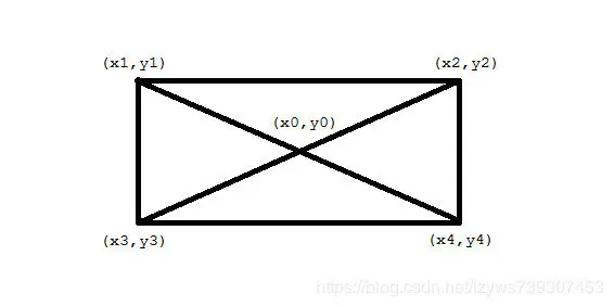 第二种方法可以通过矩形的对角线上的两个点来确定,这种方法只适用于和坐标轴平行的矩形。比如下图当中,无论我们知道了(x2, y2), (x3, y3)还是(x1, y1), (x4, y4),我们都可以将这个矩形确定下来。